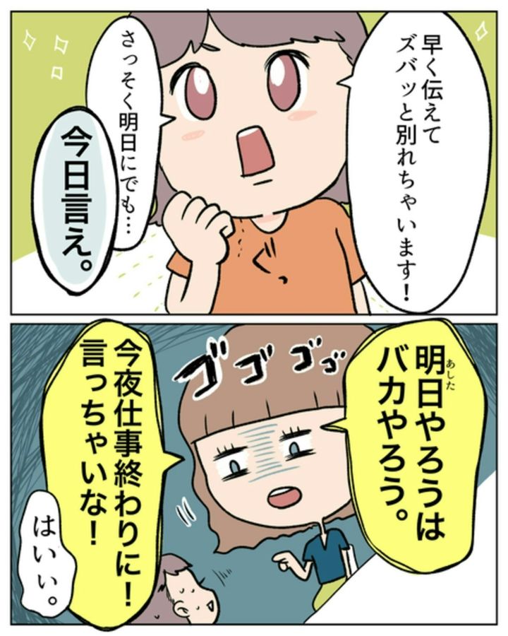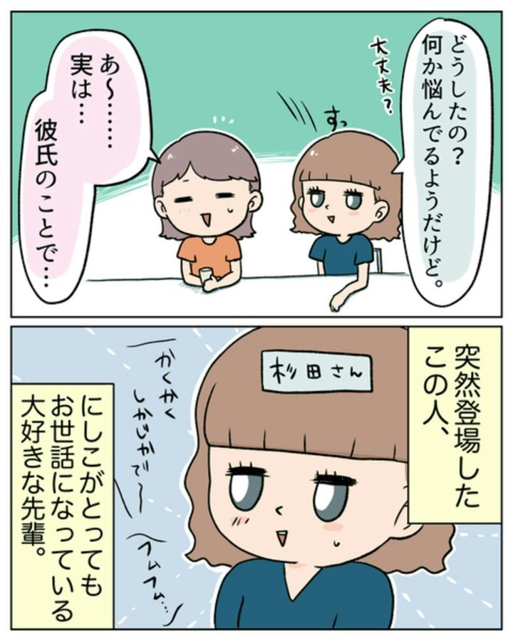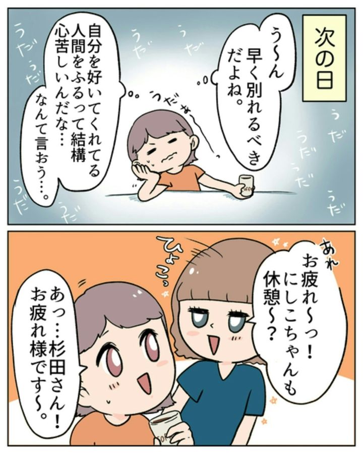 野々村くんと付き合い始めてまだ1か月ほどですが、悪いところばかり目につくように。一緒にいても疲れるだけだと感じたにしこさんは、別れを決意します。ところが、いざ別れ話を切り出そうと思っても、なかなか一歩を踏み出せません。そんなとき、会社の先輩が心強いアドバイスをしてくれました。