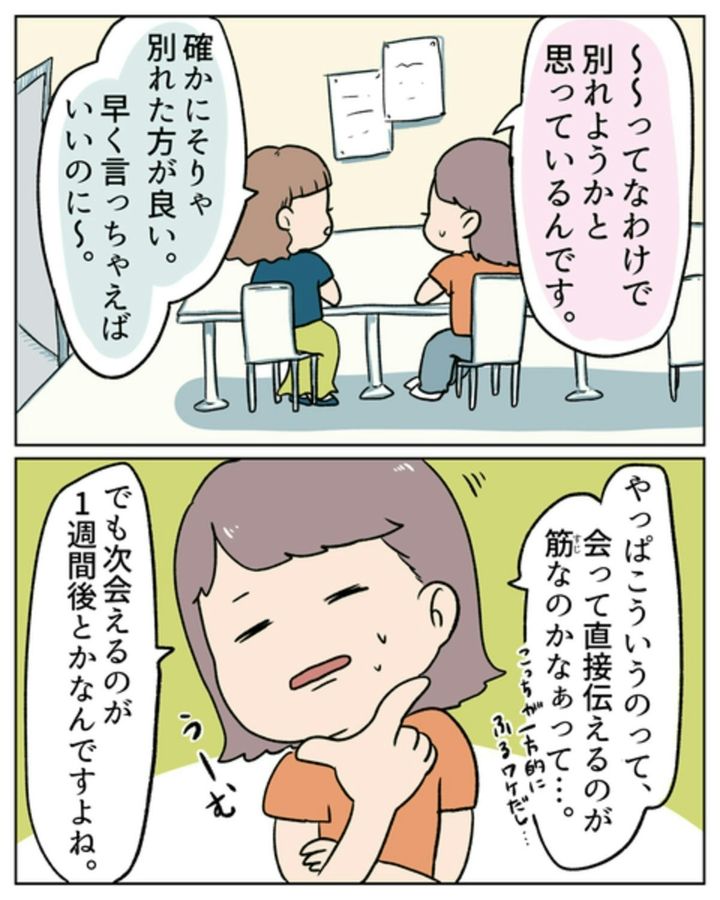 何を直せばいいか「わからない」のに、「チャンスをください」ばかりでは、あきれてしまいます。さらに、にしこさんの話をさえぎるなんて、とても失礼ですよね…。強制的に別れを告げ、無限ループを断ち切りました。このあと、改めて「今までありがとう」というメッセージを送り合い、別れに合意することができました。