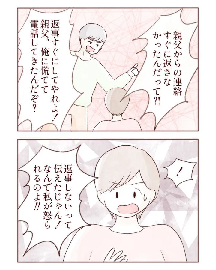 その日の夜、「親父からの連絡、すぐに返さなかったんだって!?返事すぐにしてやれよ!親父、俺に慌てて電話してきたんだぞ?」コウイチさんにそう言われ、「返事しないって伝えたじゃん!なんで私が怒られるのよ!!カナコさんが言い返しました。