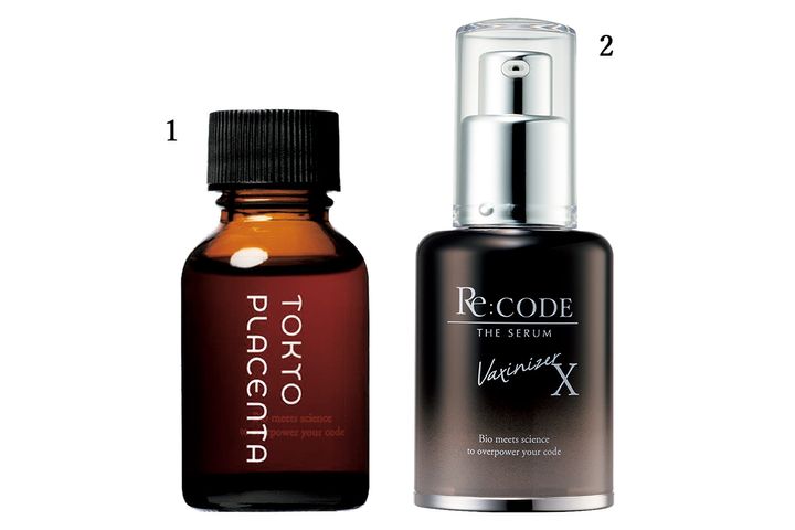 重度の敏感肌・赤ら顔を救ってくれたワクチナイザーは毎日使って早4年!季節の変わり目もゆらがないように。敏感肌と密接な睡眠不足を改善してくれたプラセンタも不可欠。1.インテンスプラセンタ ブタ 20ml ¥1,300〈編集部調べ〉(TOKYO PLACENTA 20cc) 2.Re:CODE ワクチナイザーX 30ml ¥16,500(エルムジャパン)