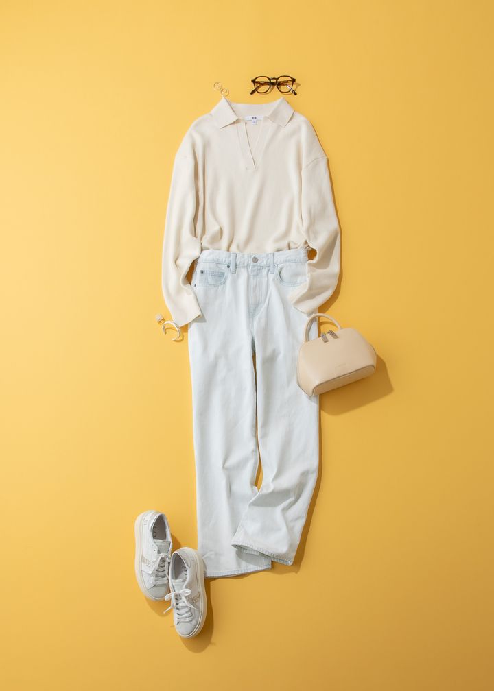 スムースコットンリラックスポロセーター¥3,990ワイドストレートジーンズ¥3,990(ともにユニクロ)バッグ¥19,800(アドカラム/アンソロジー)シューズ¥39,600(デイト)メガネ¥36,300(ブラン)ピアス¥25,300(プラウ)バングル¥92,400(ガルニ)リング¥9,900(ワンエーアールバイウノアエレ/ウノアエレ ジャパン)