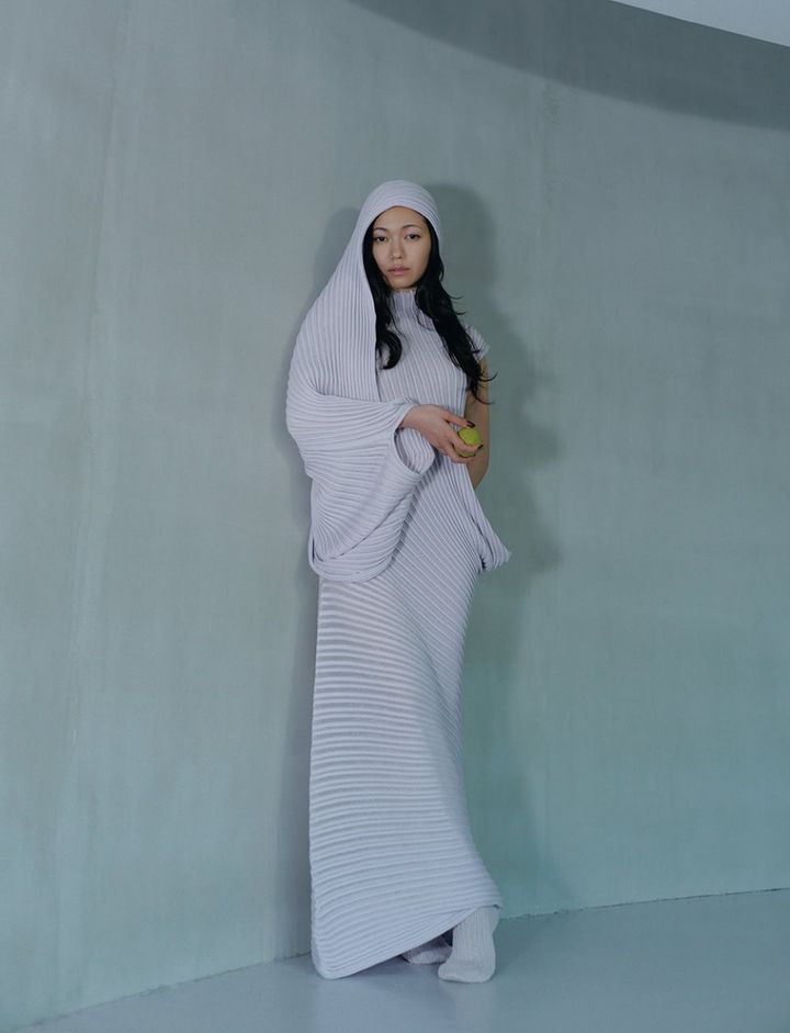 ドレス¥104,500、カーディガン¥71,500、ソックス※参考商品(全てイッセイミヤケ)、手に持ったイチジクのオブジェ¥3,850(ソウス)