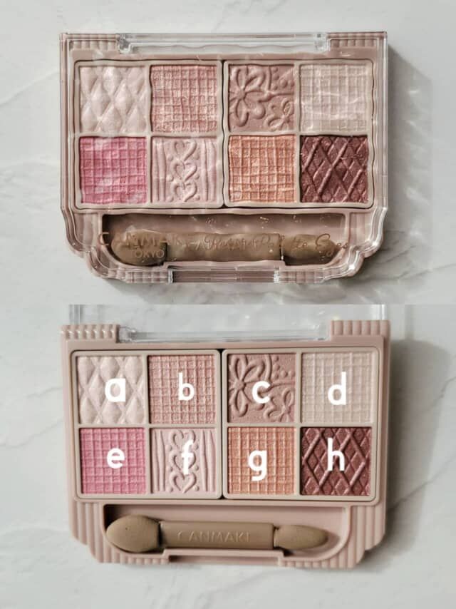 マット・パール・ラメの異なる質感を組み合わせた8色パレットは、同系色でまとまっているので初心者でも失敗知らず。a、d、fの組み合わせで自然な涙袋が作れるほか、f単体なら目尻の下まぶた三角ゾーンに入れて目幅拡張にも使えます。大人メイクのポイントは「色の重ね方」。ベースにマットな色を入れてから、ポイントでラメを乗せると浮かずに上品に仕上がります。持ち運びサイズなので、メイク直しにも重宝する一品です。