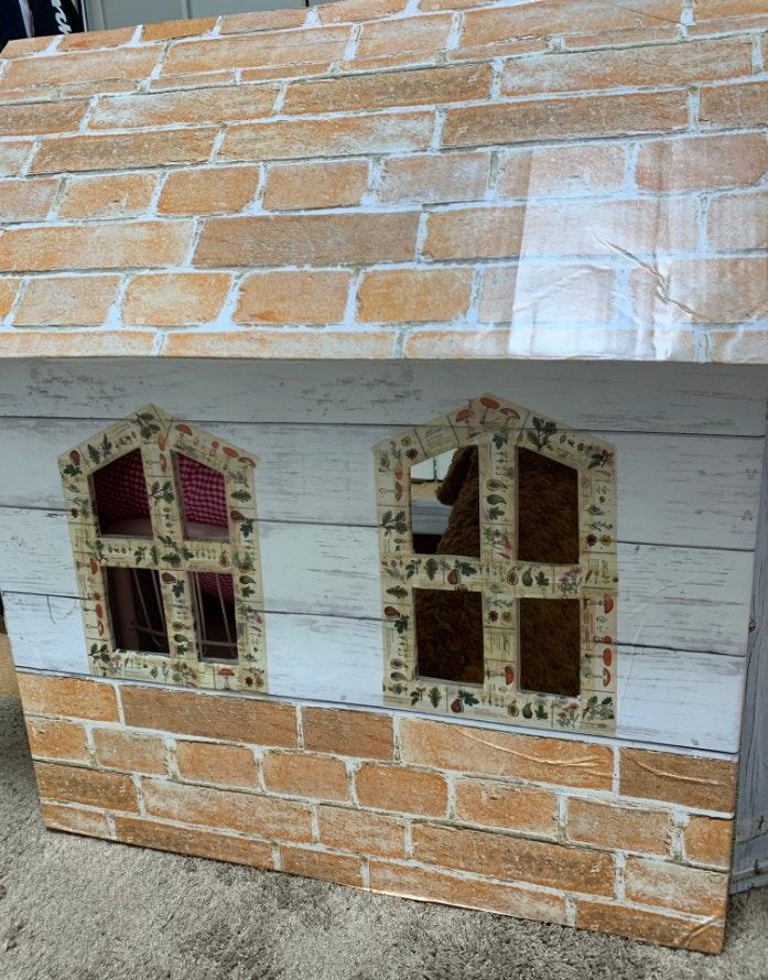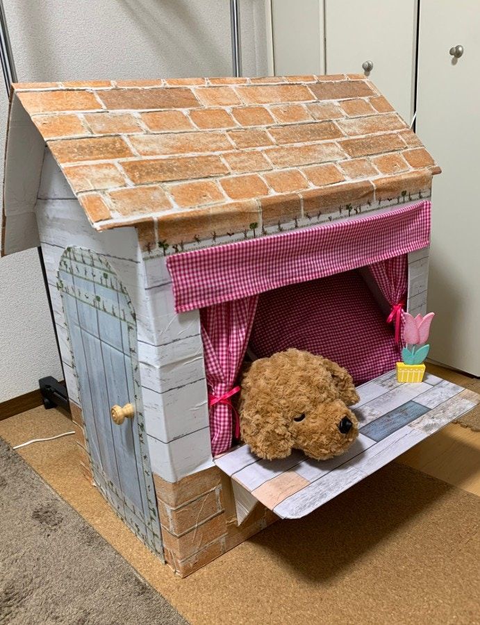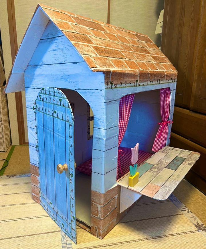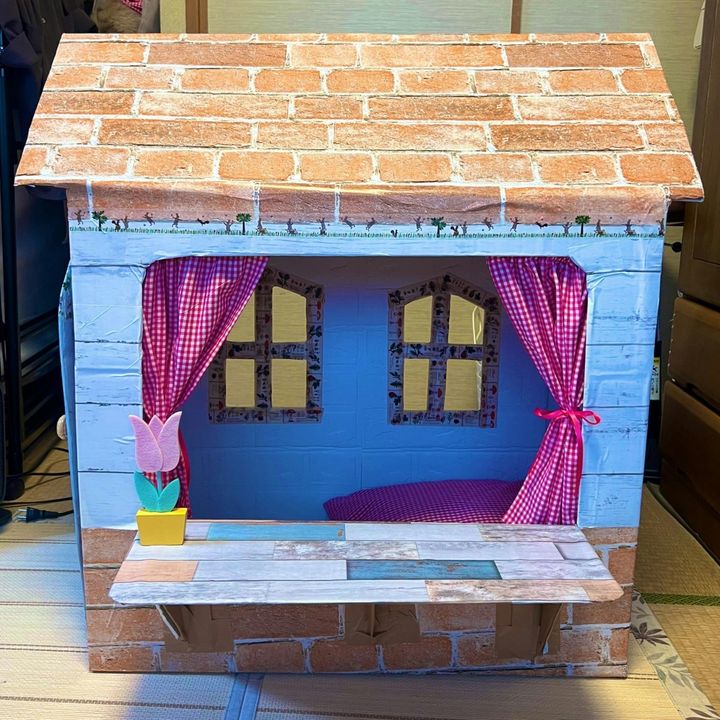 童話から飛び出してきたかのようなかわいらしいミニハウス。角が丸く切られていたり、切り口にはテープが貼られていたりと安全面にも愛を感じます。ポン丸さんの父がスマホで作り方を検索して家の土台を作り、母は100均や手芸屋で買ってきた布やリメイクシートで仕上げたそうで、取手はホームセンターで買うこだわりよう。製作のきっかけについて伺うと、以下のような回答をいただきました。