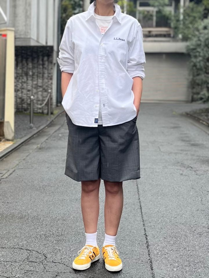 次にバミューダパンツと合わせて、最近ハマっているストリートスタイルを意識しました。この着こなしのポイントは、ズバリ、シャツのあしらいです。L.L.Beanのシャツはボタンダウン&長袖なので、実はアレンジもしやすいんです。オトナミューズウェブに掲載されているビームス安武俊宏さんの記事を参考に、ボタンダウンのボタンをあえて外し、かつ袖も無造作にロールアップしてみました。このテクニックのおかげで、すごくこなれて見えません?