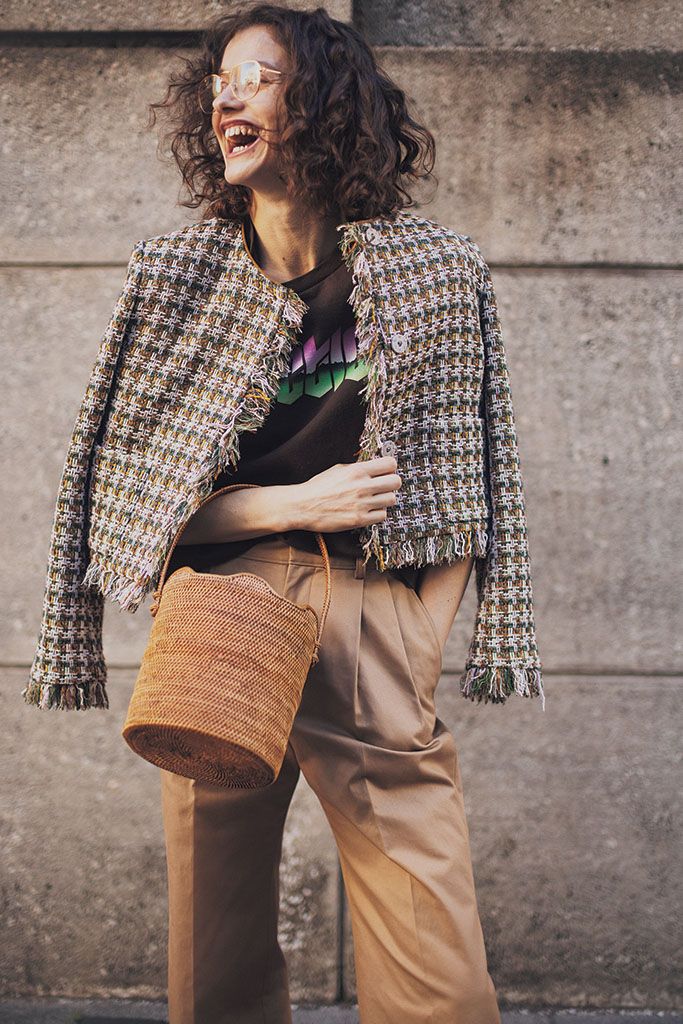 カーディガンのように気楽に羽織れるツイードジャケット。ピンクとオレンジ、白、グレーなど、多様な色をざっくり編み込んだツイード。太めの糸、数種類の色をミックスしたディテールが、カジュアルなプリントTやチノパンと相性のいい秘訣。味のある配色でもほっこり感なくキレよく着られるショート丈。ブラウンツイードジャケット/ウィム ガゼット(ウィム ガゼット ルミネ新宿店) ゴールド眼鏡/Ray-Ban(ルックスオティカジャパン カスタマーサービス) バッグ/BALI WERKSTÄTTE(ショールーム ロイト)