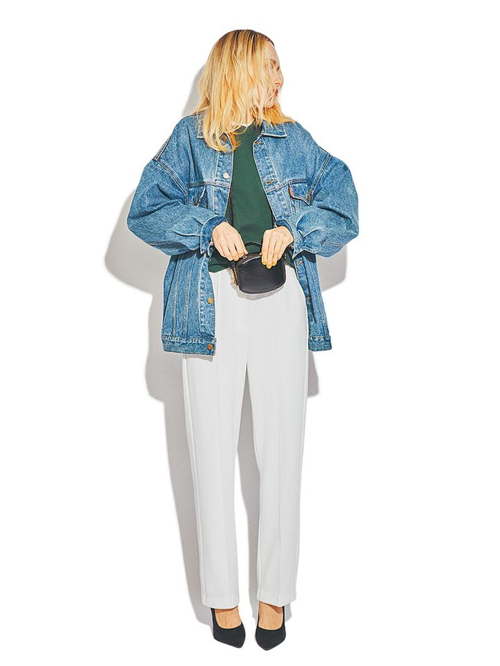女性が着ることを想定し、メンズのパターンを採用しながら、肩のラインやアームの位置など可愛く見えるように調整されたデニムジャケット。丸みのあるシルエットがキレイに出る、コシのある素材感。ヒップが隠れるほどのオーバーサイズでスタイルカバーにも貢献。 ピンタックジャージーパンツ/AKTE Gジャン/Ungrid