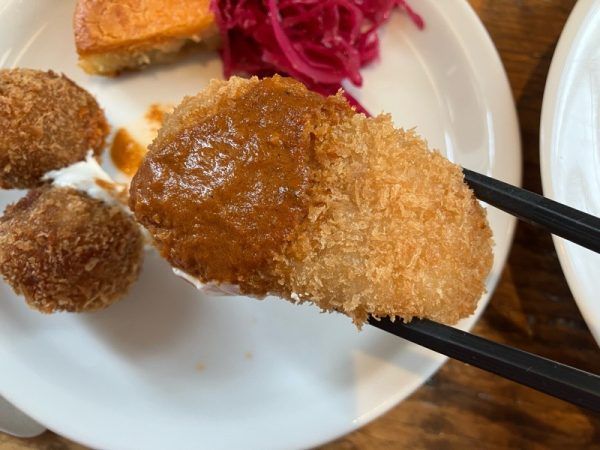 こちらのアラカルトのメンチカツボールは、黒毛和牛と黒豚を使っています。ロイヤルホストでおなじみの「黒×黒ハンバーグ」の形を食べやすいサイズに整えて、メンチカツ仕立てにしてあります。ヨーグルトソースをつけて食べるとまた風味が変わって二度、味を楽しめます。