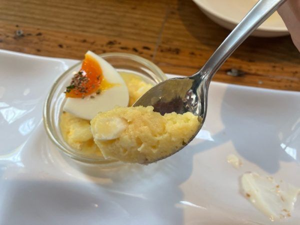 味宝卵は、福岡県鞍手郡の野上養鶏場で生産されているブランド卵です。新鮮さにこだわった栄養たっぷりの卵で、プリッと締まった白身と濃厚な味わいの黄身が特徴です。その卵を使ったポテトサラダ、ガーリックが効いていてすごく美味しかったです。