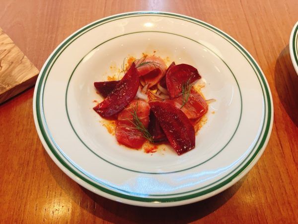 こちらは、赤い食材を贅沢に組み合わせた、目にも鮮やかなカルパッチョ。柔らかいビーツと生のままのフレッシュなビーツを組み合わせ2種類のビーツの食感と風味が本マグロの旨味を一層際立たせます。