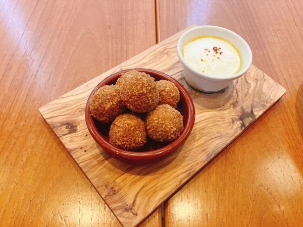 「黒×黒ハンバーグのメンチカツボール ヨーグルトソース添え」