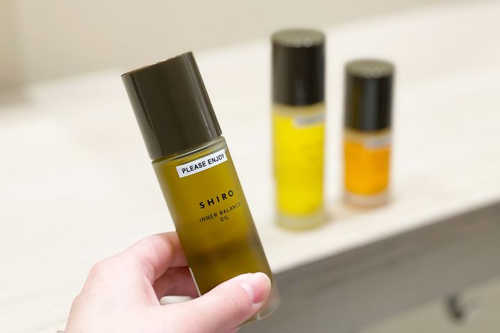 首や肩をほぐす際に使用するボディオイルは、「SHIRO」のアイテムのなかからその日の気分に合わせてセレクトします。