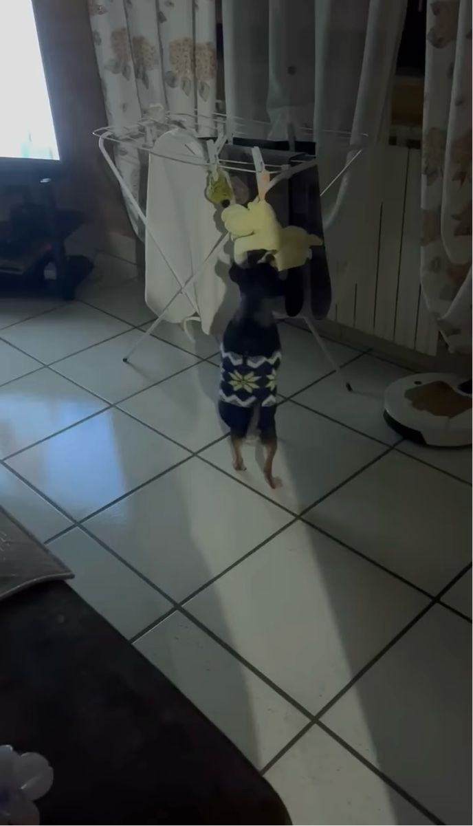 物干しスタンドに干してある洗濯物に接近する子犬。 その中にお気に入りのオモチャを発見したこの子は、咄嗟にある行動を取りました!
