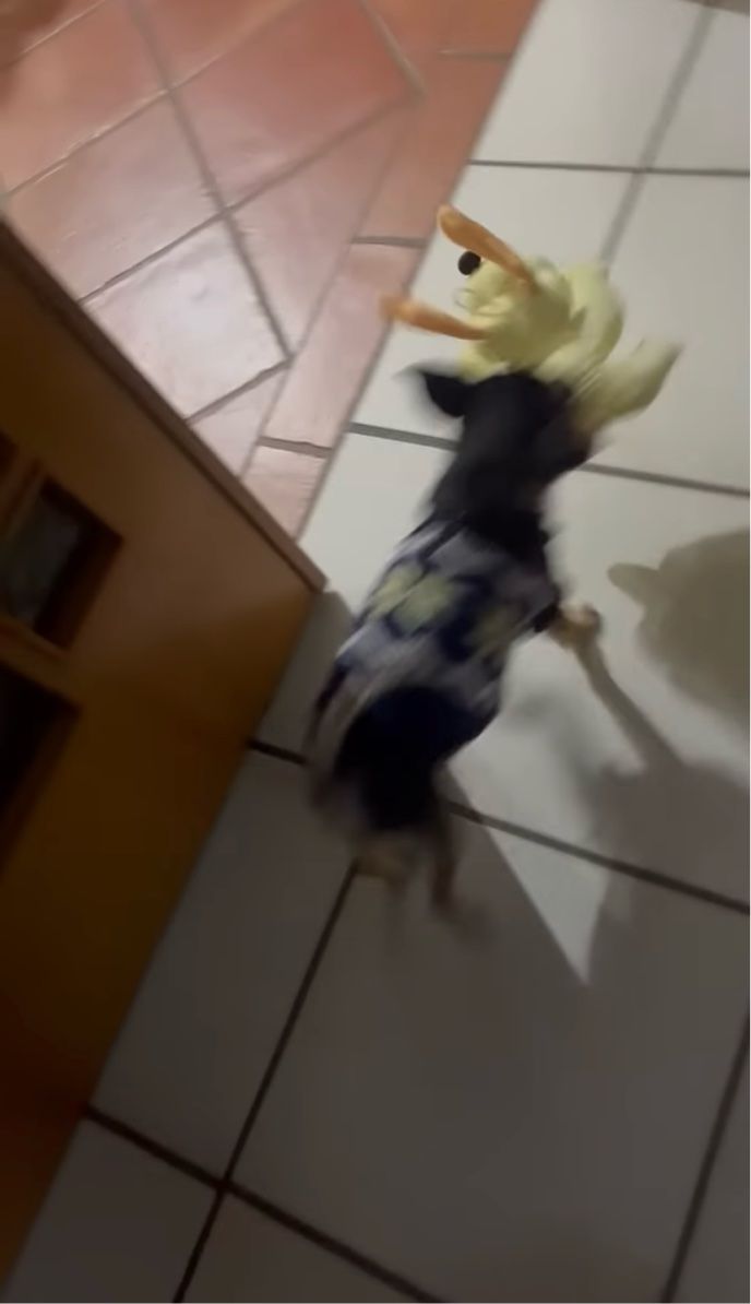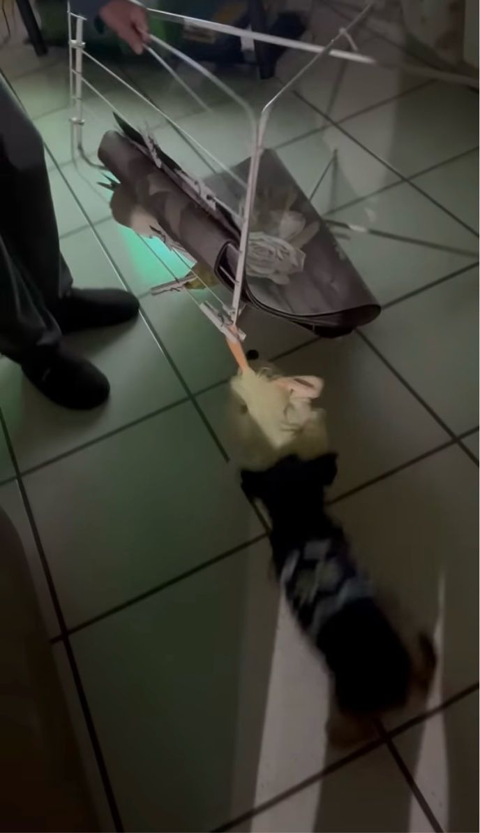 飼い主さんがオモチャを物干しスタンドから外してあげると、子犬はそれをくわえてすぐさま立ち去るのでした。 どうやら、さっそくオモチャで遊ぶみたいですね!