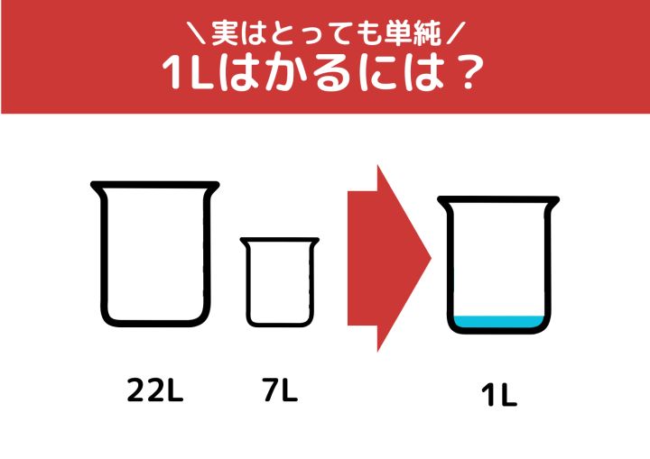 3. 【クイズ】実は単純!誰でも簡単に解けるはず?「22Lと7Lの容器で1L」をはかるには?