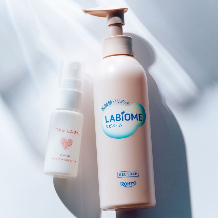 左から:「ベルサイユ宮殿の菜園から厳選されたバラ発酵菌美容液で、ふっくらと柔らかな肌に。外出中にシュッと潤いミスト。生理中もローズの香りで不快感をリフレッシュ」デリケートローズプラセンタセラム 30g ¥4,840 ※3/24発売(The LADY.)「デリケートゾーンのpHバランスが崩れないように専用ケアアイテムを使用することが大切。ラビオームのソープはジェルを密着させて洗浄。みずみずしい気持ちよさ!おりものや生理中の臭いをマスキングする効果も」ラビオーム バリアビオソープ 180ml ¥1,320 ※3/15発売(ロート製薬)