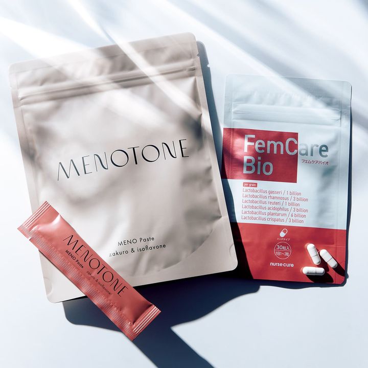 左から:「ザクロの美容成分や、女性ホルモンに関わるイソフラボンなどを含み、更年期のゆらぎをサポート。そのまま飲むほか、サラダやカルパッチョにドレッシング代わりにかけてもおいしいんです!」MENOTONE MENO Paste ザクロ&イソフラボン 10g×15包 ¥4,500(Rely-beaute)「看護師の胃腸良子さんが作ったフェムケアサプリをここ一年ほど愛飲しています。高配合されたラクトバチルス菌が生きたままきちんと届いて、膣内フローラを整えます。生理中のムズムズや匂いも軽減」フェムケアバイオ 30粒入り ¥5,400(ナースキュア)