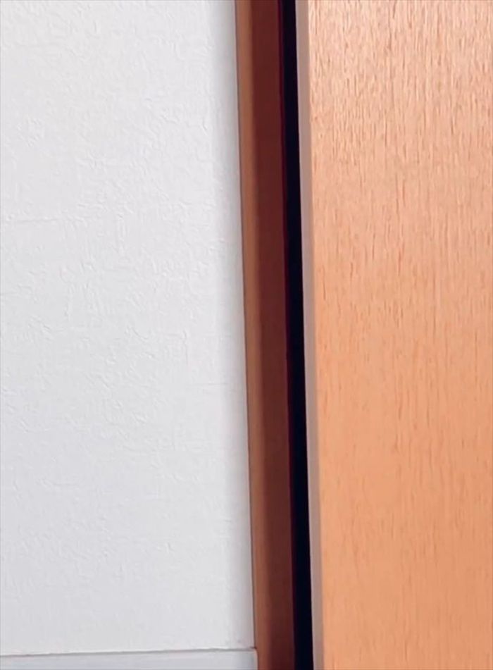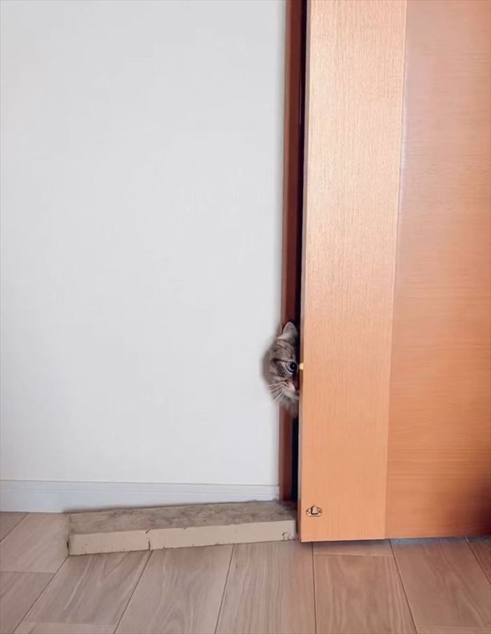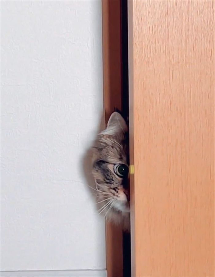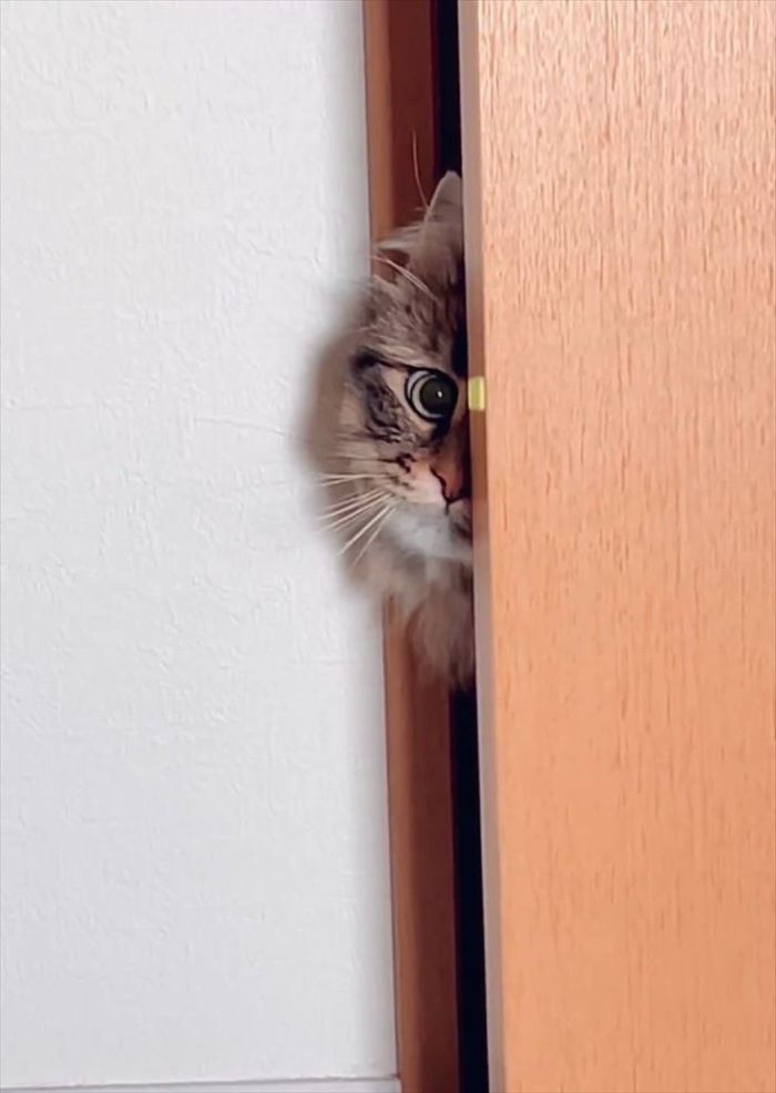 ドアの隙間からチラッと顔を半分だけ出すネコ。 この子は、気になって仕方がないものがあるようですよ!!