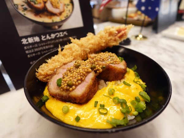 「北新地 とんかつエペ」からは、「炙りチーズ・シャトーブリアンカツ丼~エビフライのせ~」(2,350円)。低温で二度揚げしたサクサクでやわらかなシャトーブリアンと、エビフライの贅沢な組み合わせ! 炙ったアメリカ産レッドチェダーチーズが濃厚な味わいをプラスしています。