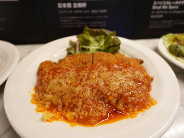 そしてアメリカの定番料理「チキンパルミジャーノ」を「日本橋 古樹軒」流にアレンジした、「アジアンチーズチキンカツ」(1,100円)。こちらも衣とソースにオランダ産ゴーダチーズが使われているのですが、ソースにはライムの葉やレモングラスといったアジアンスパイスがきいていて、新感覚の味わいでした。