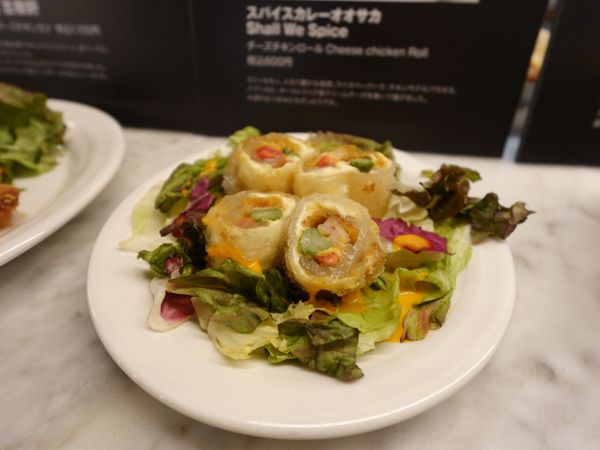 こちらは、「スパイスカレーオオサカ Shall We Spice」の「チーズチキンロール」(600円)。ライスペーパーでチキンやアスパラガス、パプリカ、オーストラリア産クリームチーズを巻いて揚げたもので、外カリッ、中はもっちりとした食感。クリーミーな味わいの中に、同店ならではのスパイス使いが楽しめます。