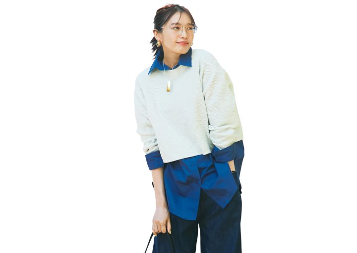 ワイドデニムパンツ¥28,600/ドレスレイブ(ジオン商事) ニット¥8,990/アンフィーロ(オンワード樫山) シャツ¥5,990/ZARA(ザラ) イヤリング¥8,800、時計¥13,200/ともにアビステ ネックレス¥18,700/マージョリー・ベア(ココシュニック 新宿タカシマヤ店) メガネ¥13,000(レンズ代込み)/OWNDAYS バッグ¥88,000/ファーロ(ユニオンゲートグループ) パンプス¥17,600/ダイアナ(ダイアナ. 銀座本店)