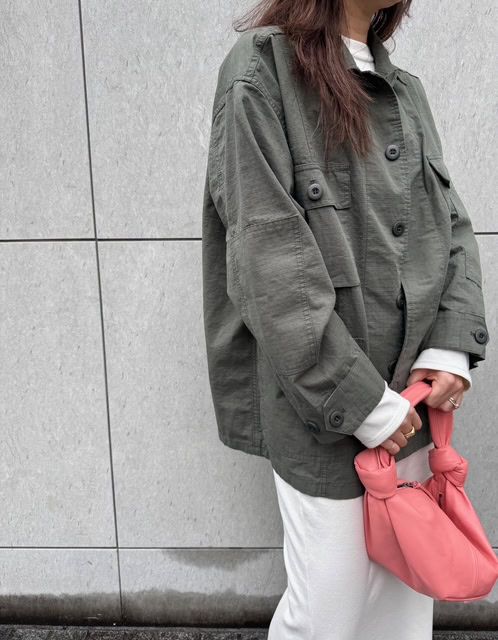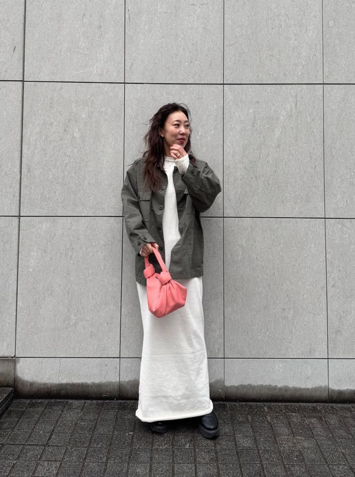 「久々にキュンとしたミリタリーシャツをメインに。どうしてもカジュアルなスタイリングになりがちなので、シルエットがキレイなワンピースに合わせてレディな着こなしに落とし込みました。アクセントとして春らしいピンクをバッグで取り入れています」