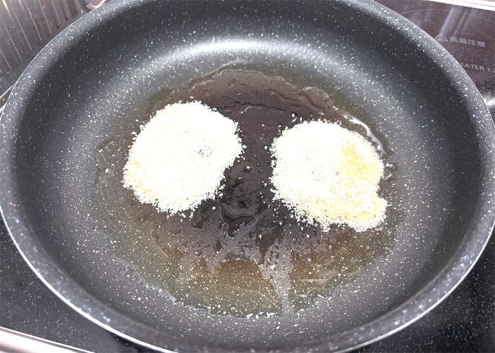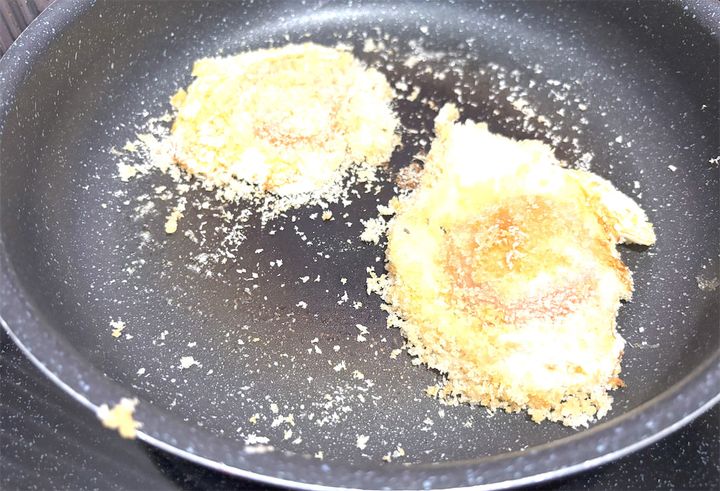 1の卵の上にフタをするようにパン粉(分量外・適量)を振りかけたら、卵を裏返して両面をカリカリになるまで焼きます。