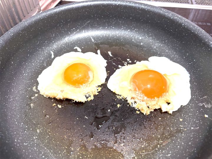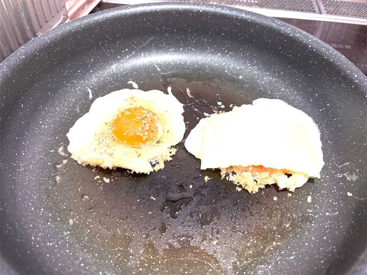 3. 【“サクサクの目玉焼き”だと!?】見た目からしてサクサク♪え、フライパンにパン粉を敷いて卵を落とす!?