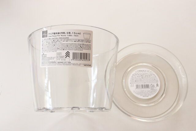 今回はダイソーの『クリア植木鉢(円形、5号、15cm)』と『クリア植木鉢皿(円形、5号、15cm)』をご紹介しました。