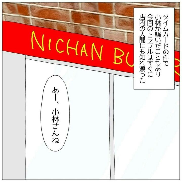 やがて、小林のいじめが明らかになったことがきっかけで、「タイムカードの犯人も小林では…」というウワサがバイト仲間で広がります。さまざまなことが明らかになった結果、小林はバイト先での居場所がなくなり、自ら辞めます。