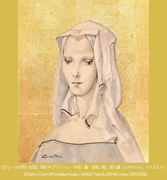 第一次世界大戦中もパリに留まった藤田は、あらためて日本の文化を見つめ直す機会を得た。流行を追いかけるのではない、自分だけの様式を模索していた藤田は、面相筆を使った極細の黒い墨の線や、金屏風を連想させる黄金色の背景、浮世絵に共通する独特のしぐさ、仏像のようなアーモンド形の眼など、日本美術の要素を積極的に自作に取り入れていった。