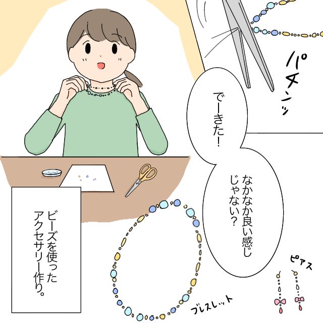 「なにしてんの」たかしさんがかなえさんの近くに行って声をかけると、「わっ・・びっくりした」と驚くかなえさんに、「お、工作?」とたずねます。「これは・・アクセサリー作ってて」かなえさんの言葉に、「あー!かなえ、そういうの前してたよね」と言った後、