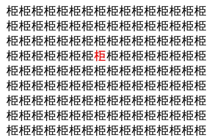 画像の中には、「栕」という漢字が縦に9行、横に16個並んでいます。 全部で144個となりますが・・・、そのうち1つは「異なる漢字」となってますよ!!