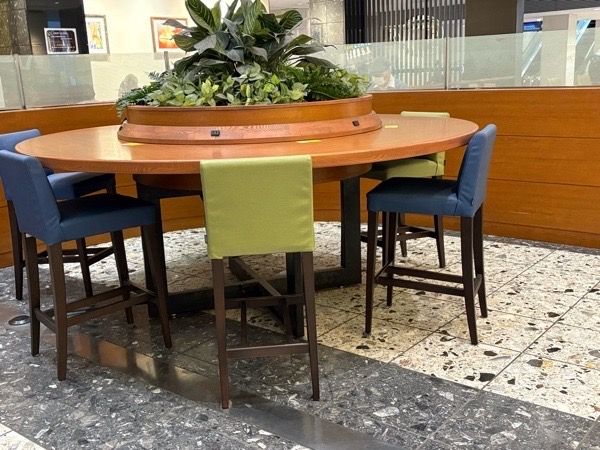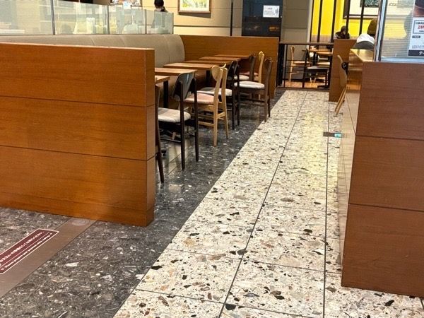 スペースも広く車椅子のままで着席できる。車椅子を置いてイスに座ることもできる。