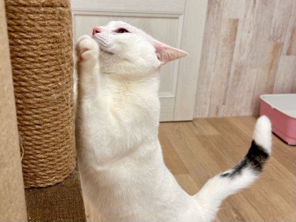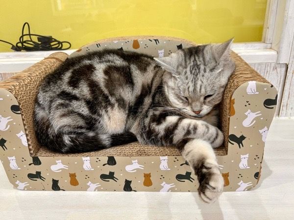 すっぽり爪とぎに収まっている子はアメリカンショートヘアさんかな。