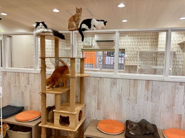 最初に入ったお部屋には10匹以上のネコちゃんがくつろいでいました。どの子も人馴れしているので、お部屋に入ると近寄ってきてくれます。スタッフさんによると、膝に乗ってくれたりもするそう。
