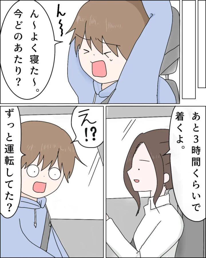 しばらくしてレイさんが「ん~よく寝た~。今どのあたり?」とスッキリした表情で目を覚ましました。エミさんが「あと3時間くらいで着くよ」と答えると「え!?ずっと運転してた?」と想像以上に時間が経っていたことに驚くレイさん。