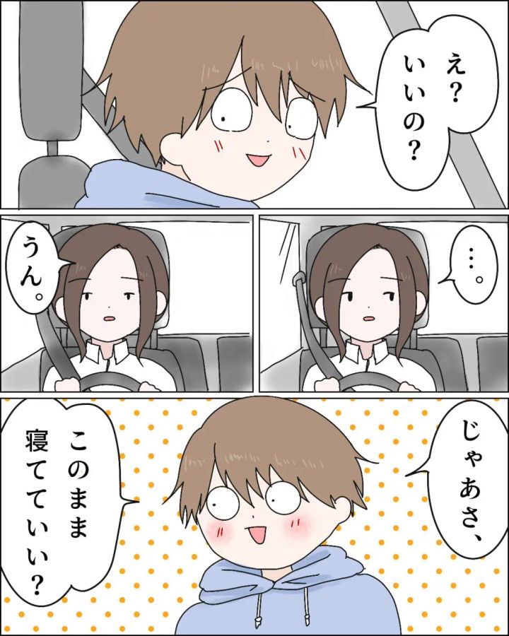 すぐに「え?いいの?」と分かりやすく表情が明るくなるレイさん。レイさんの反応を見て本当は運転したくないのだと感じたエミさんは無表情で「うん」と答えました。エミさんがこのまま運転すると決まると、すかさずレイさんは「じゃあさ、このまま寝てていい?」と聞きました。