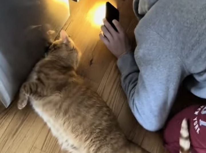 冷蔵庫の下をじっとのぞき込んでいる飼い主さん。