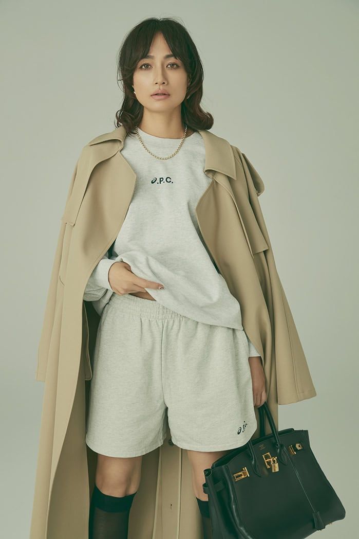 スエットトップス¥41,800、スエットショートパンツ¥28,600(共にアー・ペー・セー アシックス/アー・ペー・セー カスタマーサービス)、トレンチコート¥20,900(ミラオーウェン/ミラ オーウェン ルミネ新宿2店)、ピアス¥67,500、ネックレス¥104,400(共にトムウッド/トムウッド 青山店)、バッグはスタイリスト私物
