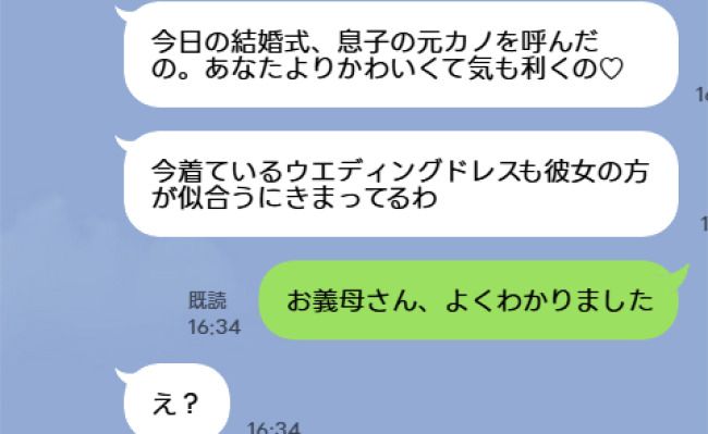 「今日の結婚式、息子の元カノを呼んだのよ。あなたよりもかわいいし気も利くの♡」