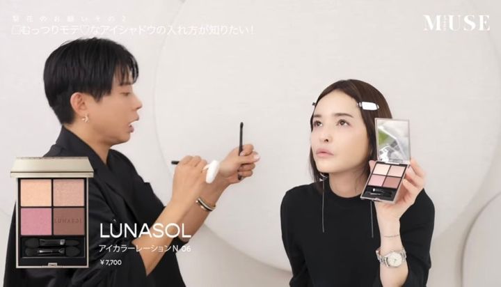 そこに使うのはやはりLUNASOLのアイシャドウ! 右上と左上のアイシャドウを2色使い。