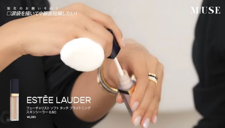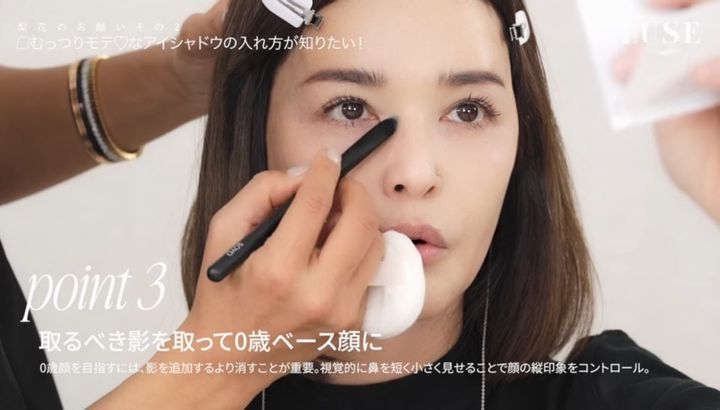 0歳顔を目指すには、影を追加するより消すことが重要。梨花さんはもともと鼻の横にある自然な影が大人っぽい印象になっているそう。その影をハイライトで消すことで、顔の縦の印象を短くコントロール。赤ちゃんのようなちゅるんとした鼻に。