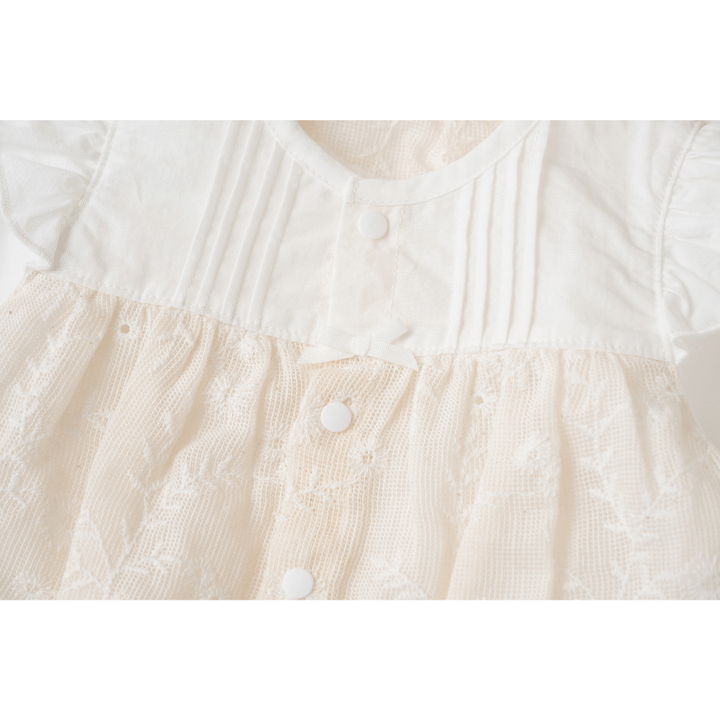 一見シンプルだけど、ディテールにこだわり抜かれたベビードレス。リボンは繊細な光沢のシルク素材を採用。ドレス本体には手触り滑らかなコットンを使用し、赤ちゃんも安心の着心地です。きらきらと輝く波のようなチュールと繊細なトーションレースが、華やかさを演出します。