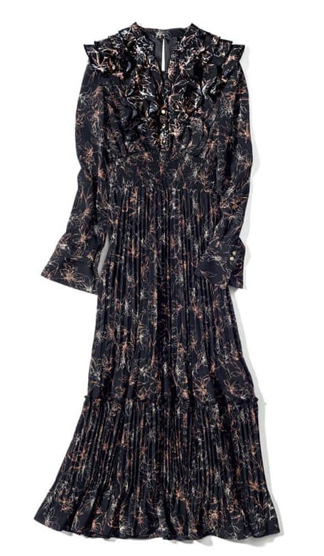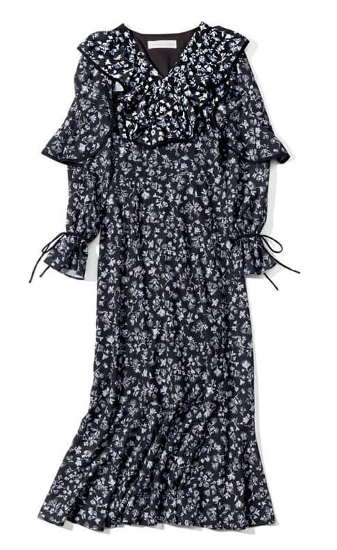 肩~胸元にかけてフリルたっぷりのフェミニンワンピも、ブラックを選べば大人でもちょうどいい甘さ。