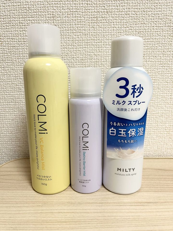 私の使い方は、コルミー VCバランスミスト→コルミー レチノバリアミストの順でつけ、その後にミルティー モイスチャーミルクスプレーをON。
