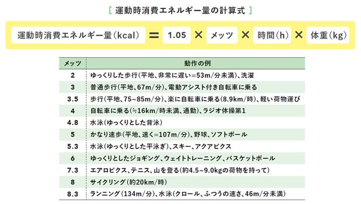 運動代謝量を推定するにはメッツを利用しましょう。メッツ指数がわかると、運動時の消費エネルギー量を導くことができます。