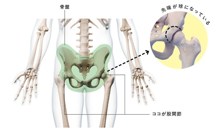 股関節は骨盤と太ももの骨(大腿骨)をつなぐ関節で、上半身と下半身を連結しています。つまり、直立二足歩行時に上半身の全体重は股関節が支えていることになるのです。また、股関節は球関節と呼ばれ、大腿骨側の骨の先端が球状になっており、骨盤側の骨にハマるようになっています。