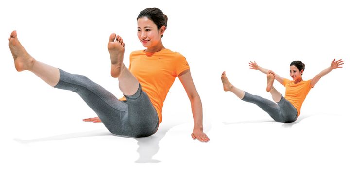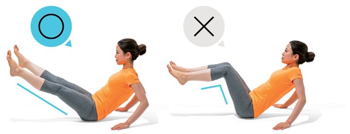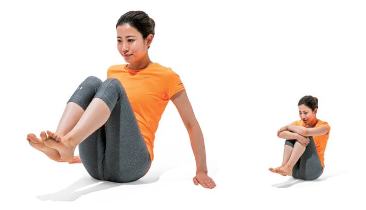 ヒザを曲げ、両脚を揃えて床から離します。お腹を同時に鍛えたい人は、写真右のようにヒザを抱え込みましょう。